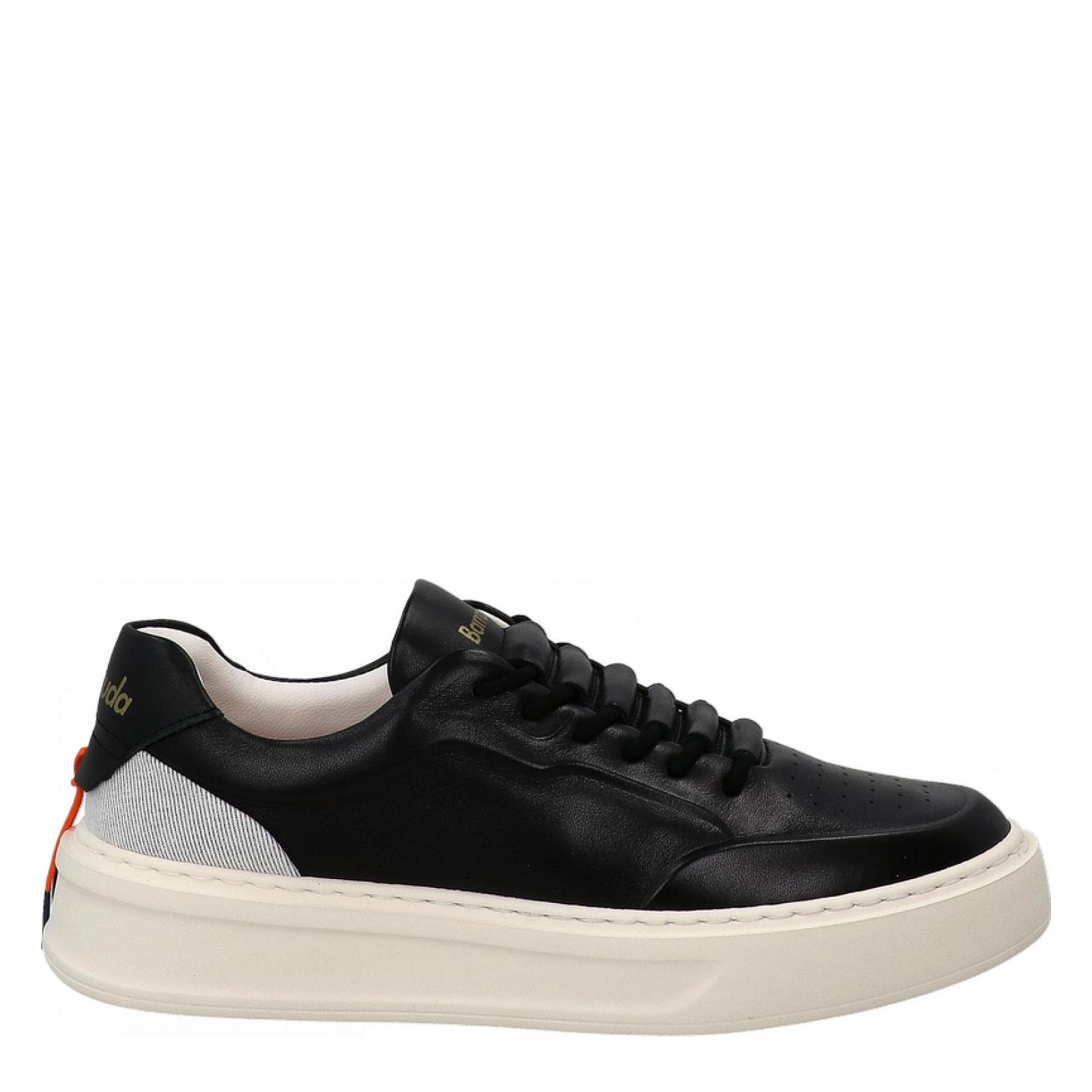 Barracuda sneaker with lacing detail, purple leather heel and orange and blue applique on the back.