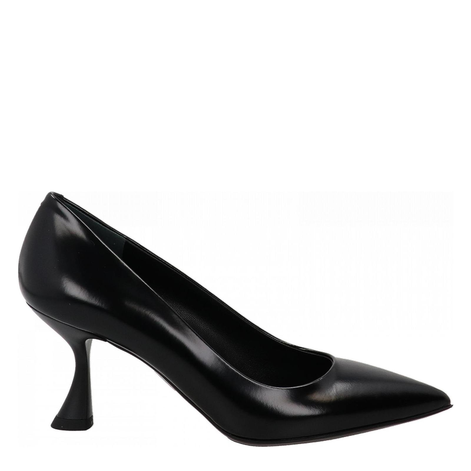 Décolleté con punta sfilata in pelle spazzolata nera con tacco particolare a rocchetto alto 7 cm che rende molto sicura la camminara. Suola in gomma antiscivolo.