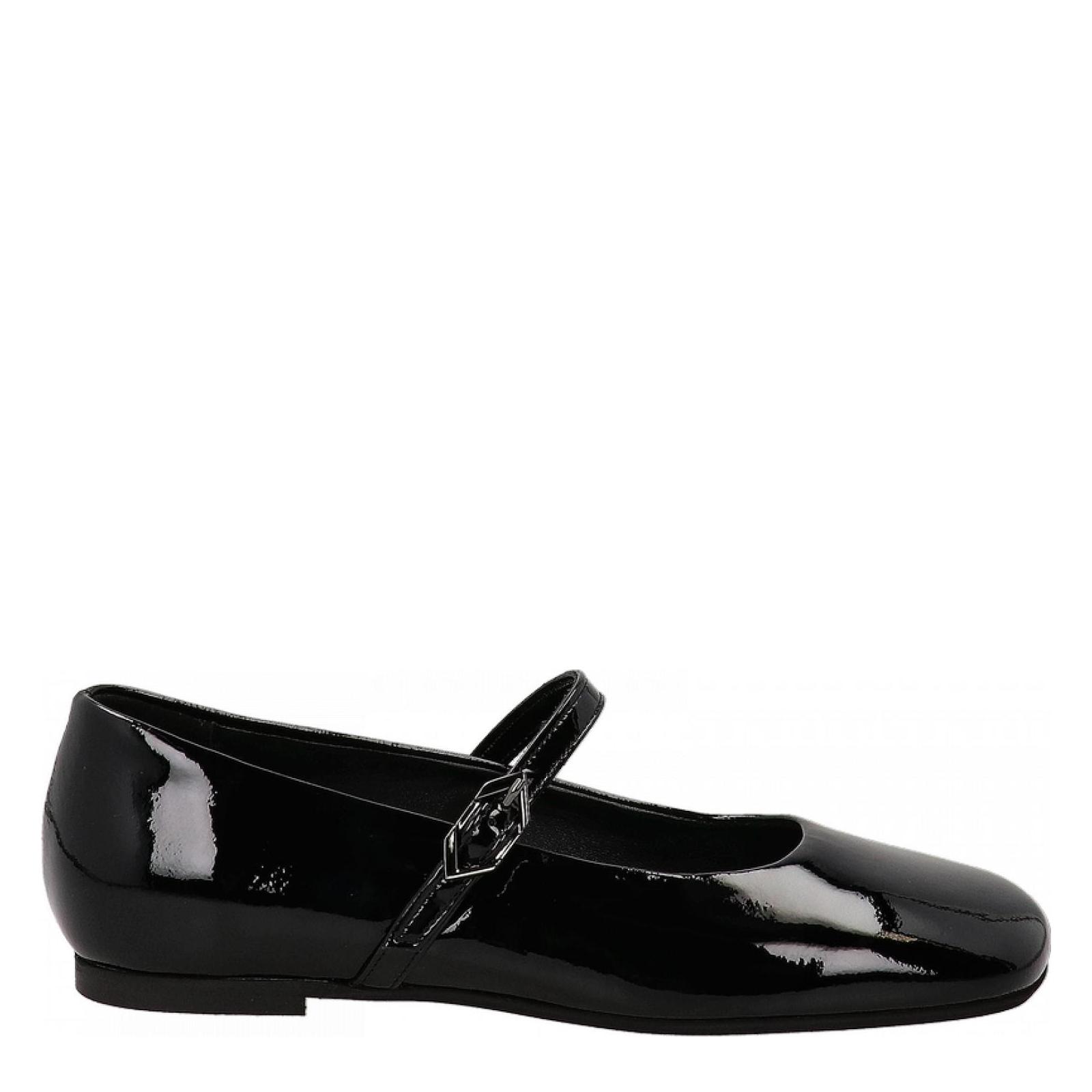 Ballerina con cinturino e punta squadrata realizzata in pelle verniciata. Fodera interna in pelle e suola in gomma antiscivolo. Altezza tacco 1 cm. Made in Italy.