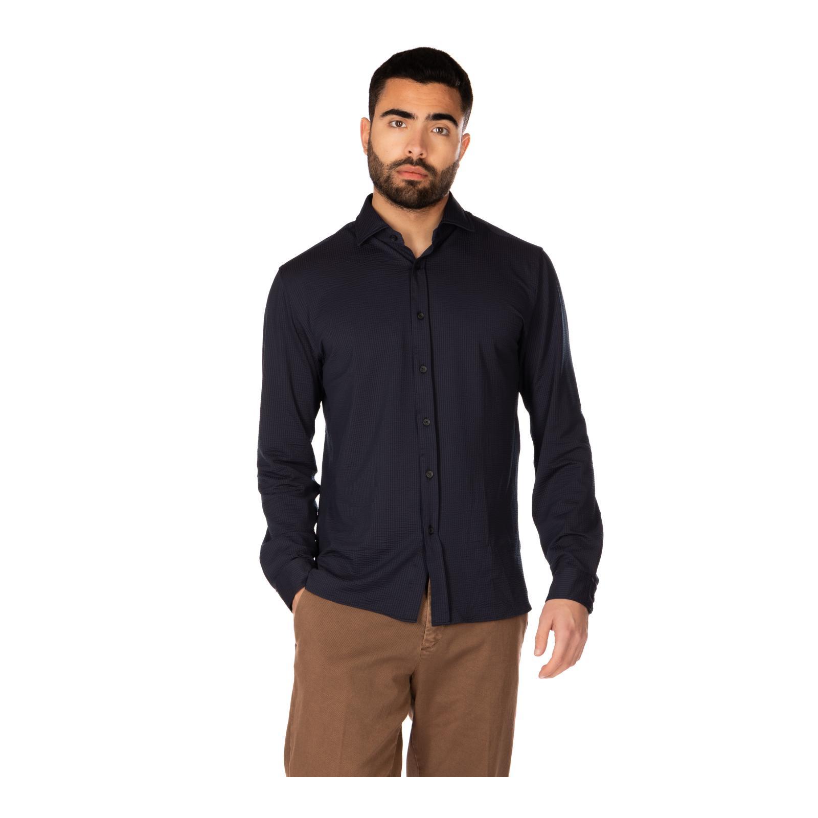 Camicia uomo con collo francese semi morbido, realizzata nella vestibilità intermedia tailor fit, realizzata in tessuto active seersucker blu, questo capo rispetta la migliore tradizione di camiceria sartoriale.