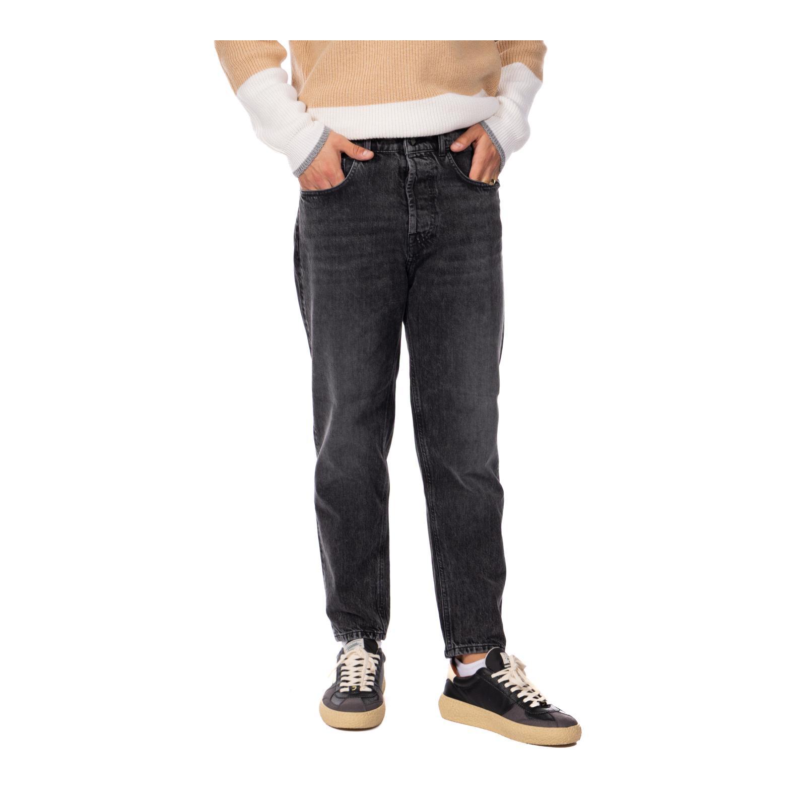 Denim black wash e leggero effetto used, con vita media con passanti e iconico passante in tessuto logato sul retro. Carrot fit.